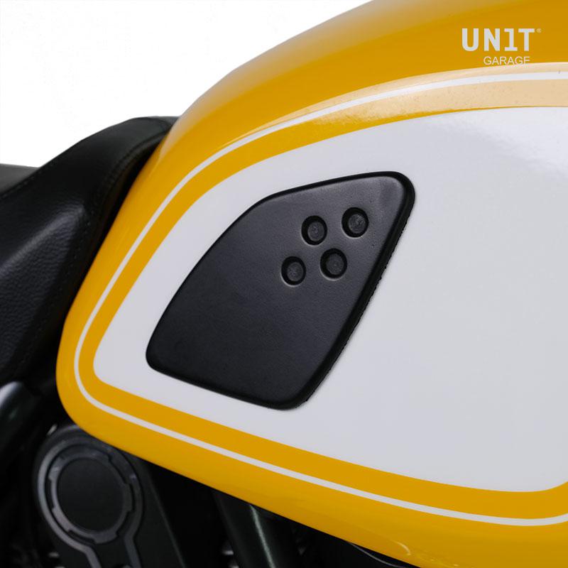 Par de rodilleras kit Fuoriluogo en goma . Con adhesivo fuerte, listo para ensamblar. Completa el aspecto del tanque y protege las rodillas en uso todoterreno.