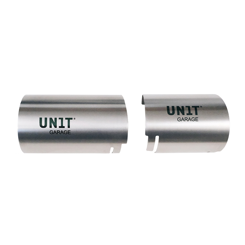 Par de cubiertas de colector de admisión de acero inoxidable satinado, derecha e izquierda, con el logotipo de Unit Garage.