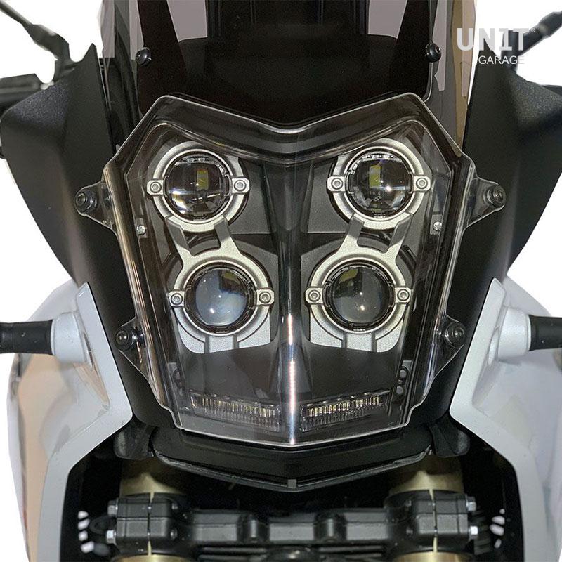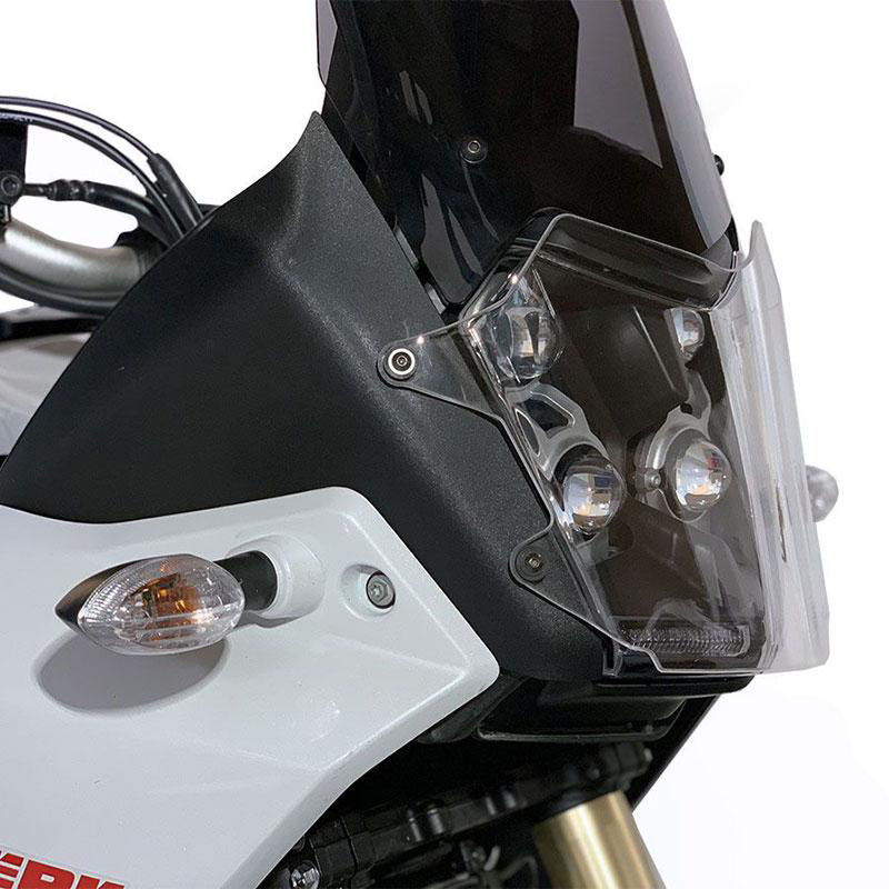 Protección de la luz frontal en material transparente a prueba de golpes, completo con kit de tornillos de montaje.
