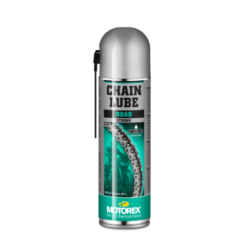 Lubricante para cadenas Motorex Chainlube Road, blanco, potente y de larga duración. Especialmente diseñado para motocicletas de carretera, para cadenas con juntas tóricas, X-ring y Z-ring. Excelente adherencia, resistente al agua. Prolonga la vida útil de la cadena.